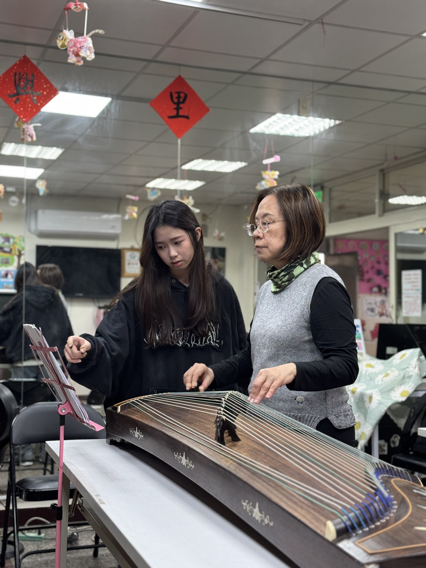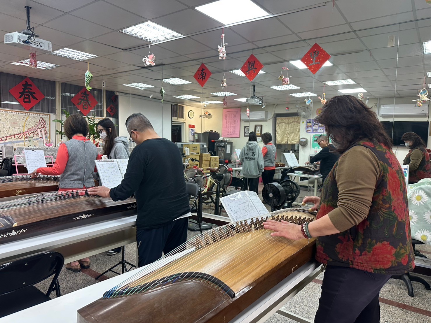 課程自113年10月起展開,由本校國樂系學生何詩雅與吳芷妘擔任授課教師,課程內容涵蓋經典曲目如〈笑傲江湖〉、〈月亮代表我的心〉與〈春江花月夜〉等。教學循序漸進,從樂譜閱讀、節奏練習到技巧演奏,逐步引導長者們掌握古箏基本功,並嘗試簡易曲目彈奏,課堂氣氛熱絡、充滿笑聲與樂聲。